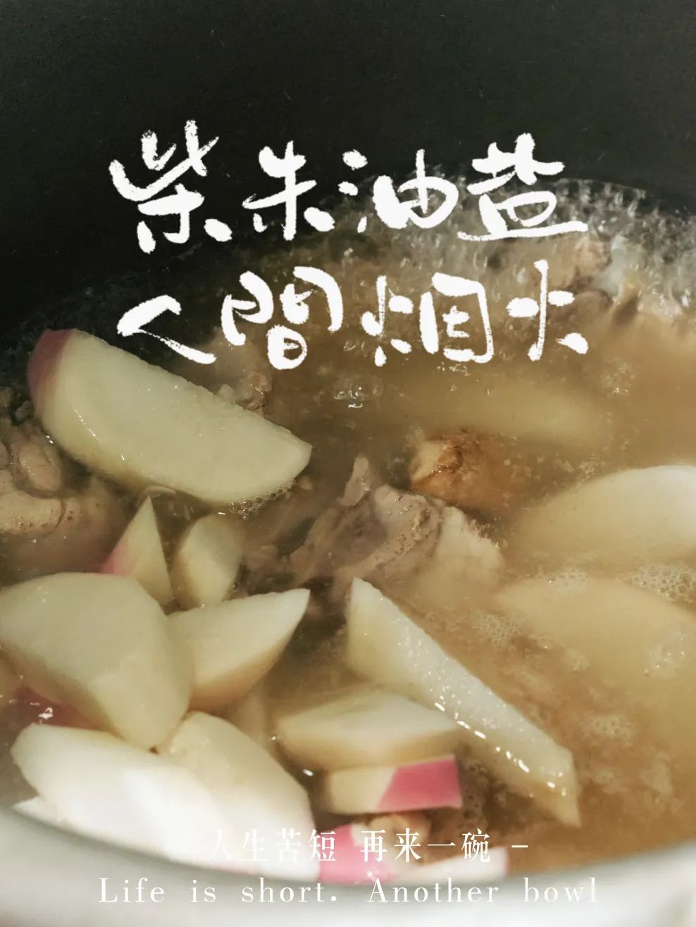 萝卜的白色和排骨的金黄色漂浮在汤面上。