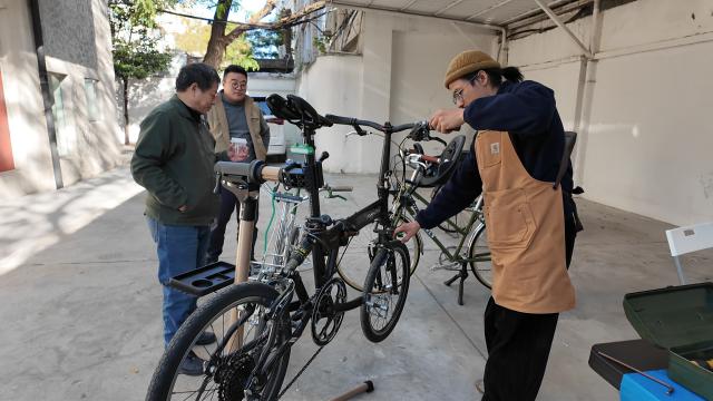 位于巨鹿路上 2 Wheels Bicycle 在活动现场,主理戴俊友忙于为几名白领和居民提供自行车,进行螺钉检查、刹车变速器调整等免费维修。