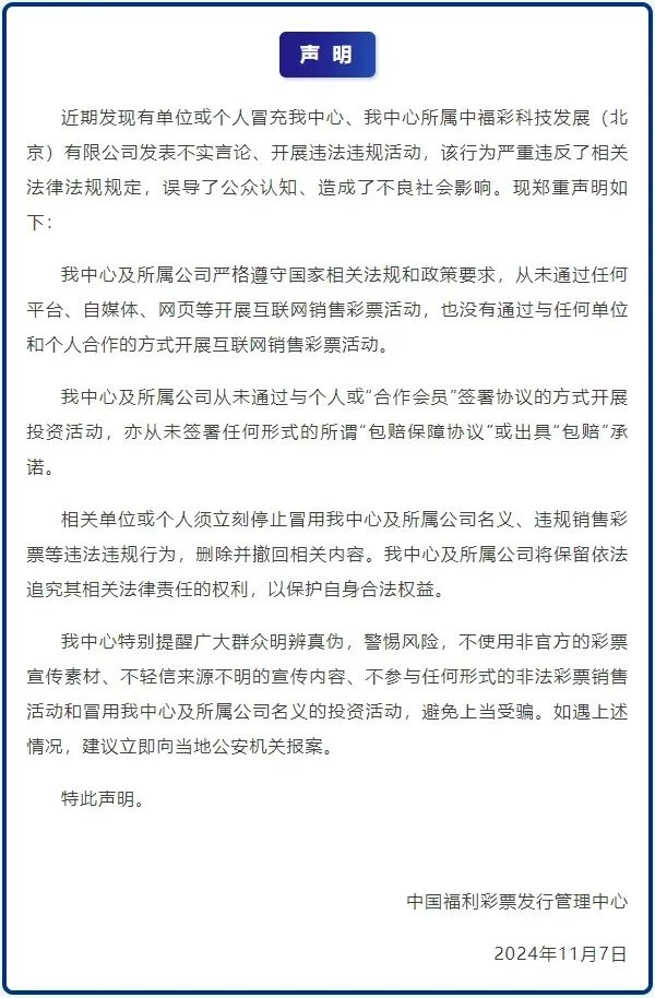 相关单位或个人应立即停止使用我们中心及其公司名称、非法销售彩票等违法违规行为,删除并撤销相关内容。为了保护自己的合法权益,我们中心及其所属公司将保留依法追究相关法律责任的权力。