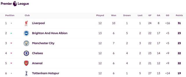 这次比赛结束后,布莱顿先赛一场积分来到这里。 23 分。前 13 轮,布莱顿 6 胜 5 平 2 负面。在官方积分榜上,他们暂时把曼城推到了后面。在积分、净胜球、进球相同的情况下,布莱顿以相互的战斗优势排名第一(11 月 9 日,布莱顿刚刚 2-1 击败曼城)。
