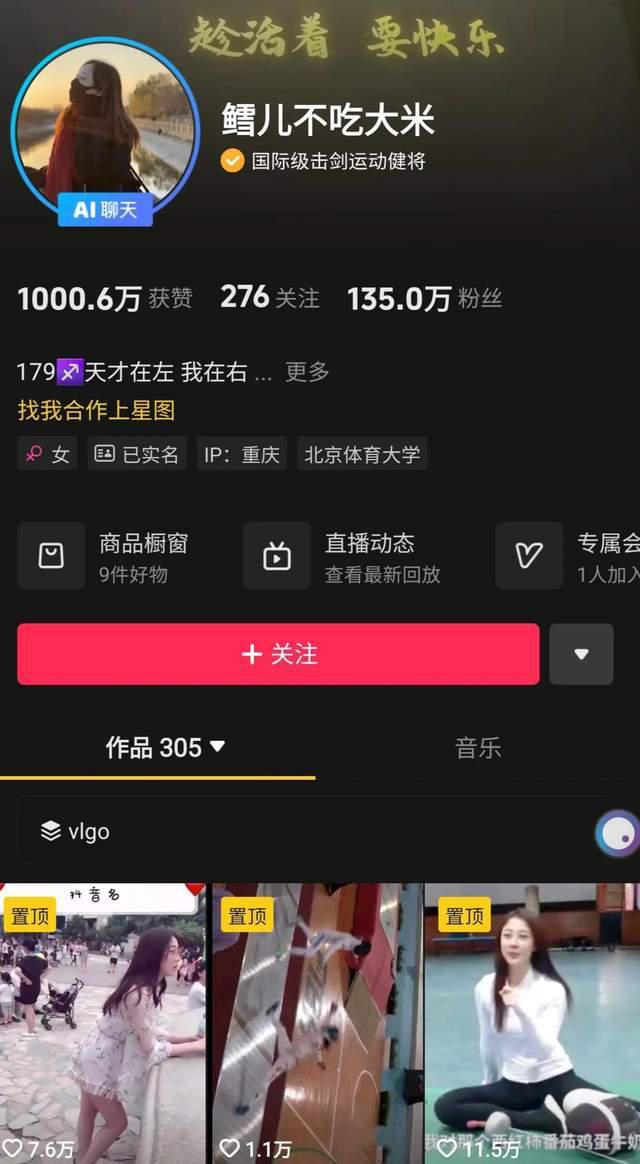 没想到,这个帐号的持有者竟然是前中国击剑运动员秦雪,他的首页认证信息显示为世界级击剑运动员。