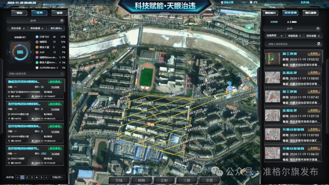 In response to pressing issues such as construction waste and illegal buildings, Juungar Banner has introduced a new model for urban management–"technology-empowered sky eyes for illegal activities". This includes a low-altitude intelligent patrol system comprising daily inspections, special task inspections, emergency patrols, and data services. By leveraging the unique aerial perspective of drones, urban management departments can quickly identify problems and take prompt action.