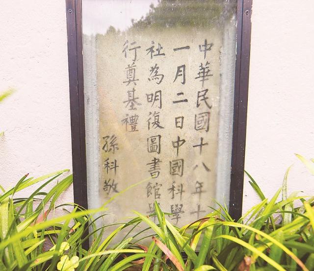 “明复图书馆”奠基碑镶嵌在明复楼东南的外墙根部,碑文由孙中山子孙科题词组成。