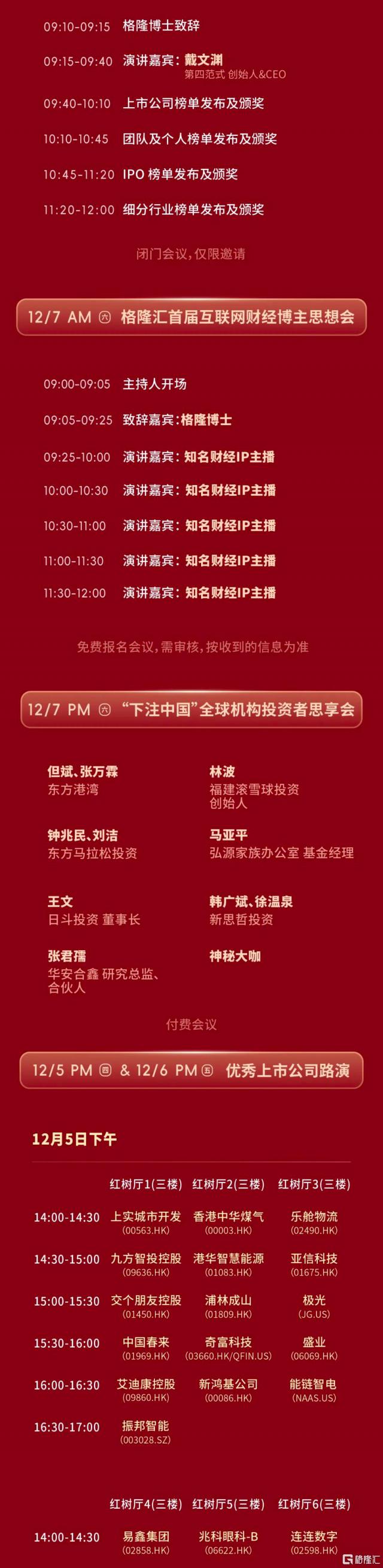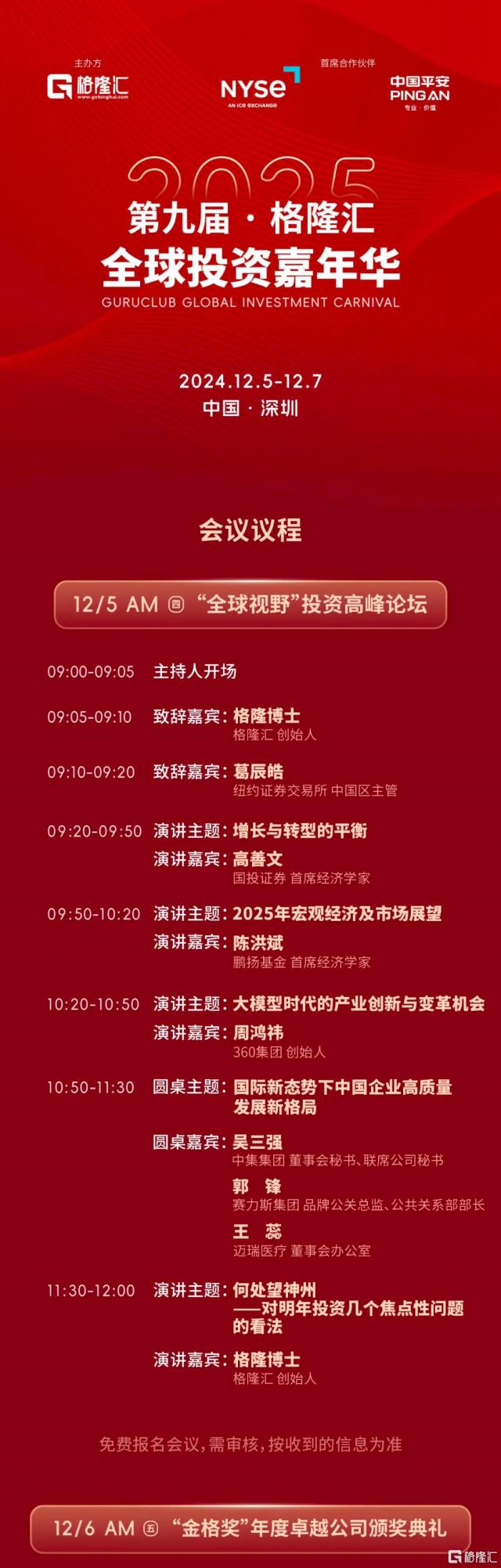 12 月 5 日 -7 日,【第九届•格隆汇•全球投资嘉年华• 2025】拉开深圳的序幕,现在 3 天会期间,将举办年度优秀公司颁奖典礼、首届互联网金融博主思想会、“赌注中国”全球机构投资者思享会、上市公司路演会等活动。分别为“全球视野”投资高峰论坛和格隆汇“金格奖”。
