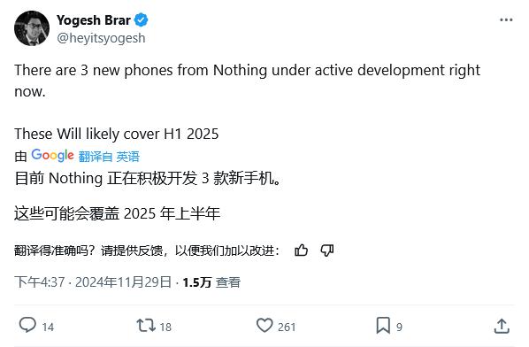 IT 世家 11 月 30 每日消息,消息来源 Yogesh Brar 昨日(11 月 29 日)在 X 在平台上发表文章,爆料称 Nothing 正研发 3 一款智能手机,有可能是 2025 推出于2008年上半年。
