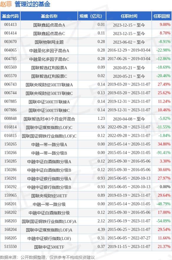 赵菲先生:中国国藉,毕业于北京师范大学概率论与数理统计专业,硕士学位,具有基金从业资格。2008 年 8 月至 2011 年 5 曾任国泰君安证券股份有限公司证券及衍生品投资总部投资经理 ;2011 年 5 月至 2012 年 11 本月曾担任嘉实基金管理有限公司结构产品投资部专户投资主管。2012 年 11 每月加入中融基金管理有限公司,现任指数投资部执行总经理职务。现任中融中证一带一路主题指数分级证券投资基金 ( 2015 年 5 月起至今 ) 、中融证券银行指数分级证券投资基金 ( 2015 年 6 月起至今 ) 、中融国证钢铁行业指数分级证券投资基金 ( 2015 年 6 月起至 2023 年 11 月 ) 、中融中证煤炭指数分级证券投资基金 ( 2015 年 6 月起至 2023 年 11 月 ) 、中融中证白酒指数分级证券投资基金 ( 2015 年 9 月至 2016 年 5 月 ) 、中融多因素混合发起型证券投资基金 ( 2016 年 12 月至 2019 年 3 月 ) 、中融量化小盘股发起型证券投资基金 ( 2017 年 5 月至 2019 年 3 月 ) 、央视财经中融 50 交易型开放式指数证券投资基金 ( 2019 年 3 月起至 2023 年 11 月 ) 、央视财经国联 50 交易型开放式指数证券基金连接基金 ( 2019 年 3 月至 2023 年 11 月 7 日 ) 基金经理。国联中证 500 交易型开放式指数证券投资基金主管基金 ( 2019 年 11 月至 2023 年 11 月 ) 。国联中证 500 交易型开放式指数证券投资基金主管基金 ( 2019 年 11 月至 2023 年 11 月 ) 。2019 年 12 月 31 日至 2023 年 11 月 7 日本担任国联中证 500 交易型开放式指数证券基金与基金经理联系。2020 年 4 月 8 日任中融智选对冲策略 3 每月定期开放灵活配置混合型发起型证券基金经理。2020 年 5 月 21 日本中融智选股票型证券投资基金基金主管。2023 年 06 月 02 日本中融物联网主题灵活配置混合型证券投资基金经理。2023 年 12 月 15 日任国联鑫起点灵活配置混合型证券投资基金经理。