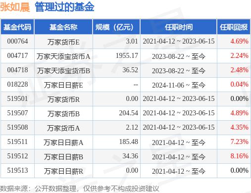 张如晨妇女:中国国家贷款,中国人民大学金融硕士,2019 年 12 现任现金管理部基金经理助理,月入万家基金管理有限公司,从事债券研究工作。曾经是万家现金宝金融市场证券投资基金的基金经理助理。2021 年 4 月 12 日起担任万家日薪金融市场证券投资基金主管、万家金融市场证券投资基金主管。 ( 2023 年 6 月 5 日离任 ) 。2023 年 8 月 22 日起担任万家天添宝金融市场基金基金主管。2024 年 11 月 16 日起担任万家鑫橙纯债券型证券投资基金主管。
