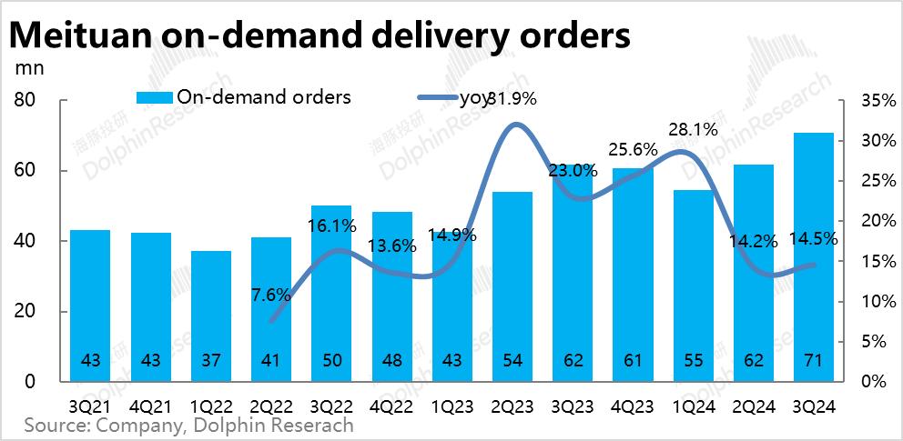 核心指标体现在家业务(餐饮外卖和闪购)中。--也就是说,本季总单量约为71亿单,同比增长14.5%,增长率与上季大致持平略有增长,基本符合公司指导。结合近期闪购订单增速和外卖订单增速,增速约为3。:1的关系,外卖业务的单量应该仍然略超过10%。。可以看出,在23上半年的低基数期之后,在其中期内,美团外卖业务的增长速度已经大致平稳。
