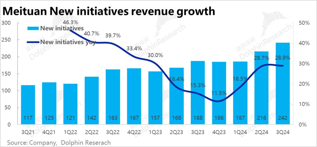 除了核心的回家和进店业务,以美团优化(社区团购)和大象超市(直营前置仓库)为核心,以及自行车和海外业务。本季创新业务收入242亿元,同比增长28.9%,较上赛季略有加速,也比市场预测多出8亿左右,同样表现不错。。根据公告中对企业的解释,主要是小象、优选等零售业务增长较强,国外市场带来的增长也可能有所贡献。