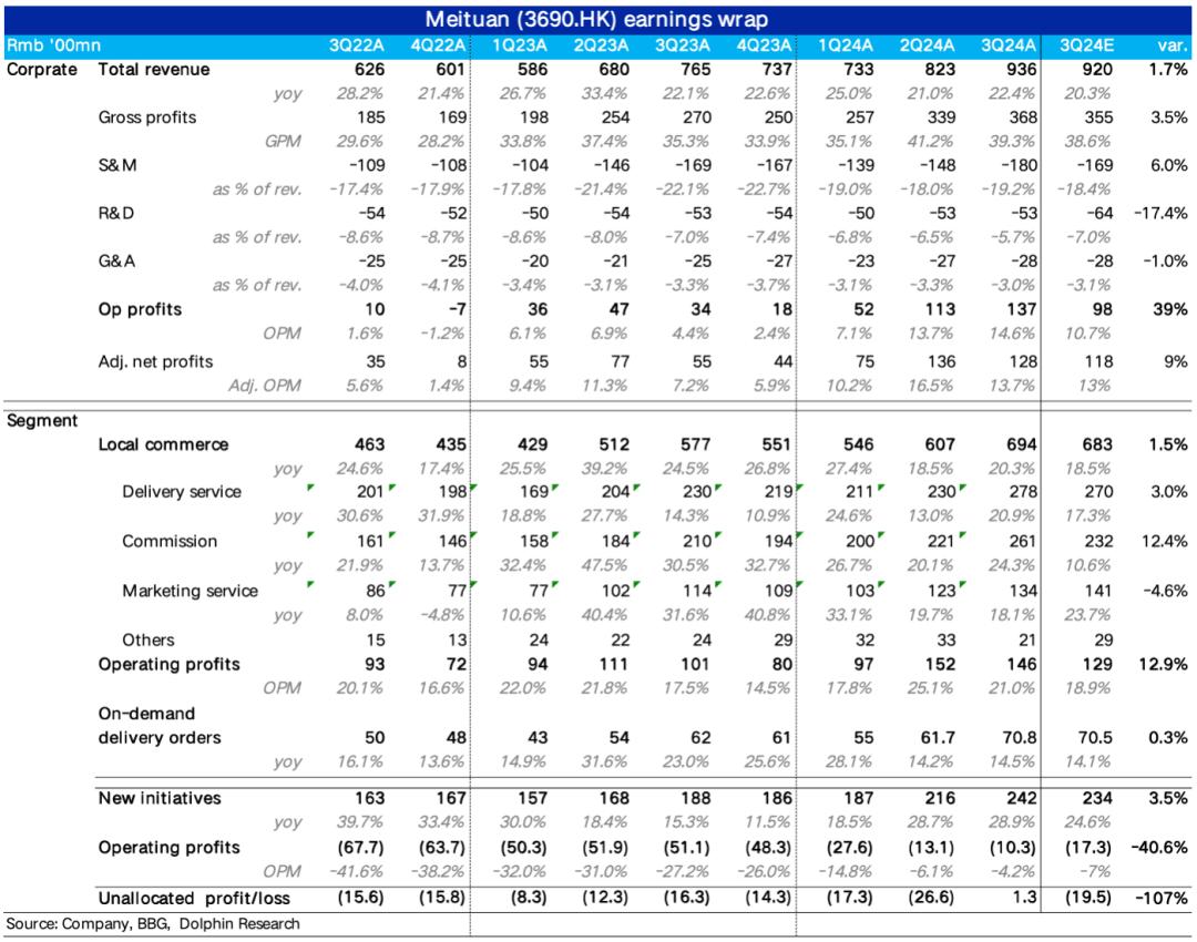 11月 29日港股市场之后,美团发布 2024 在第三季度的财务报告中,在很多泛消费同行的表现依然“雷声滚滚”的情况下,美团本季度的收入&利润双双明显beat的表现依然出色,具体来说:
