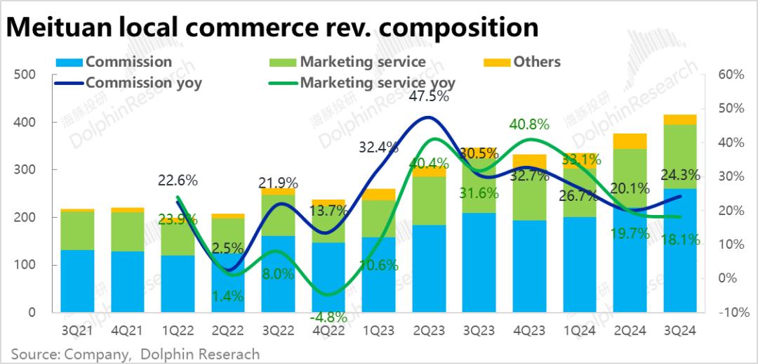 但是“相辅相成”广告收入增长率环比下降约1.6。pct,一涨一跌,又将佣金与广告业务的差距扩大到6pct,不禁让人想起22~23年初抖音与美团在进店业务上的残酷竞争。在我们看来,仅仅依靠单季的表现还不足以说明美团和抖音对商家广告投流的竞争再次明显上升,仍然需要观察。在宏观因素下,不排除商家对非直接转换的推广费用比例整体下降所致。