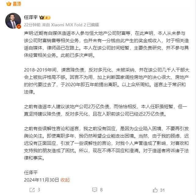 11月30日,任泽平在发表声明回应最近的网络谣言时表示:“最近有媒体谣言说我参与了恒大房地产公司的财富。在此声明,我从未参与过企业财富销售等相关业务,也没有一分钱产生奖金或收入。对于媒体的相关谣言,律师函已经在路上了。我在公司待的时间很短,主要负责研究,不参与具体的业务。之前已经说过好几次了。”