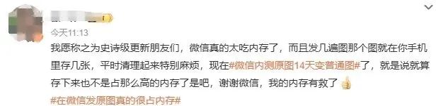 所以,对于微信内测“原图、原视频14天自动清理”功能,很多网友直言:自己的内存终于“得救”了。