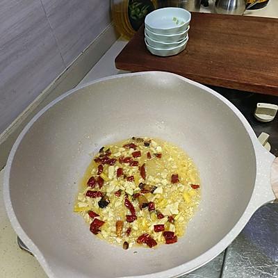 1、锅里烧油,放入姜片、蒜末、辣椒段爆香(不吃辣椒的可以在这里不放辣椒)