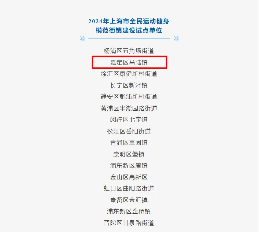 近日,“2024年上海市全民运动健身模范街镇建设试点区”名单发布,全市共有16个街镇当选,其中嘉定区马陆镇名列前茅。