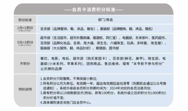 按照胖东来会员卡的消费积分标准,百货、服装部的积分标准是 1 元 =1 积分,超市部、电器部、东来茶、眼镜部等。 5 元 =1 积分。