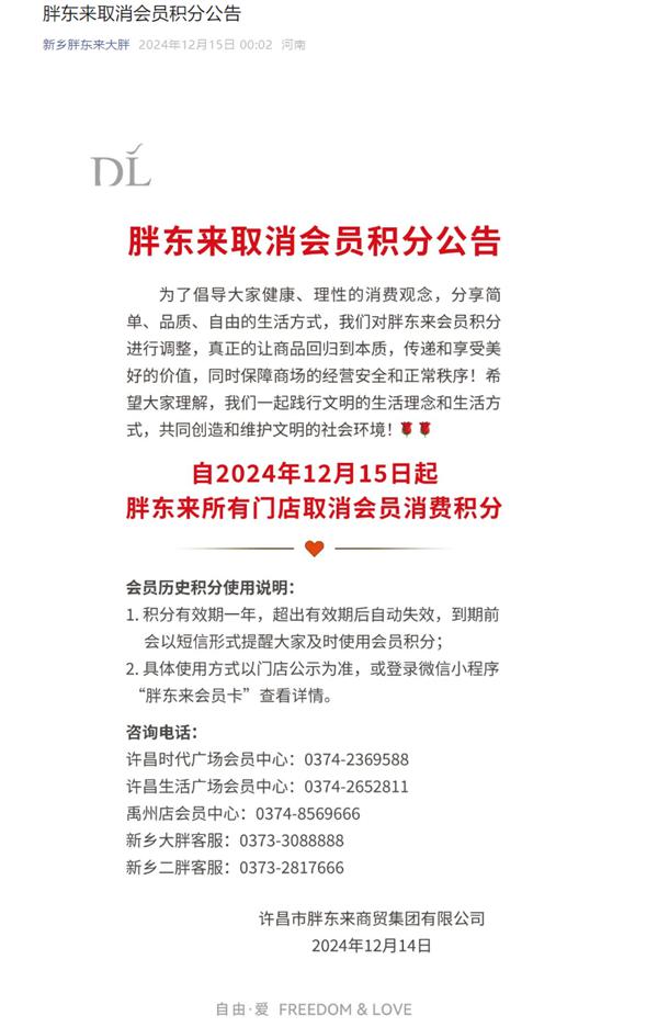 近日,胖东来发布公告,宣布自己。 2024 年 12 月 15 从那以后,胖东来的所有商店都取消了会员消费积分。