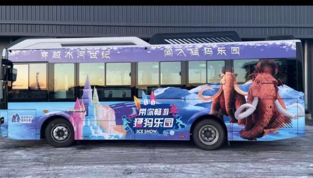 走近“猛犸象公园公交专线”,首先映入眼帘的是车身上显眼的字眼:带你去猛犸象公园旅行。车身以冰雪色为主色调,车身组合活泼可爱的猛犸象卡通形象,视觉冲击力强。此外,车身的外观巧妙地融合了滑雪、滑冰等冰雪娱乐场景和冰雪景观元素,构成了冬季冰雪漫游的快乐画面。