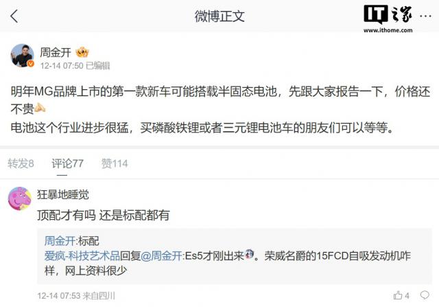 IT 家人注意到,周在评论区回复网友时提到,以半固态电池为标准。