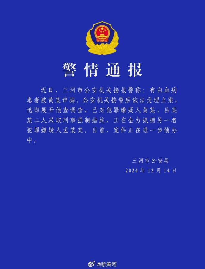 12月14日,据河北省三河市公安局报道,近日,三河市公安部门接到报警,称有白血病患者被黄某诈骗。接到报警后,公安部门受理立案,立即展开调查调查。犯罪嫌疑人黄某某和吕某某采取了刑事强制措施,正在全力逮捕另一名犯罪嫌疑人孟某某。目前,该案正在进一步调查中。