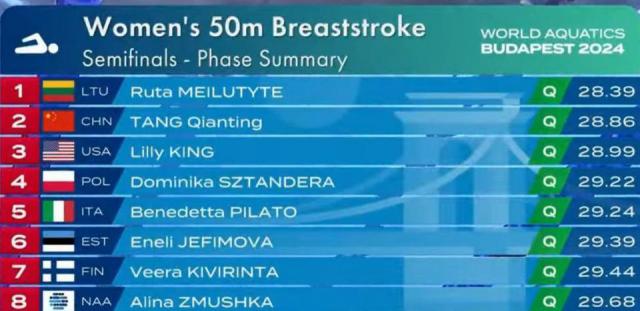 女子 50 在米蛙泳半决赛中,唐钱婷游出了 28 秒 86 所有参赛选手的成绩,排名第一 2 位置,顺利进入最后的决赛。梅卢提特,世界纪录保持者。 28 秒 39 排名预赛第 美国的莉莉金也同样游入其中 29 在几秒钟内,这两个人将成为唐钱婷最大的对手。
