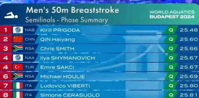 海洋在男人身上 50 游出了米蛙泳半决赛 25 秒 60 成绩,半决赛所有选手排名第一。 2 位置,只落后于俄罗斯著名将普里戈达。 25 秒 48。克里斯南非球员 - 史密斯 25 秒 66 创造新的世界青年记录。八 有一些选手入选决赛, 7 人游进 25 秒 70 在价格以内,决赛的竞争将非常激烈。