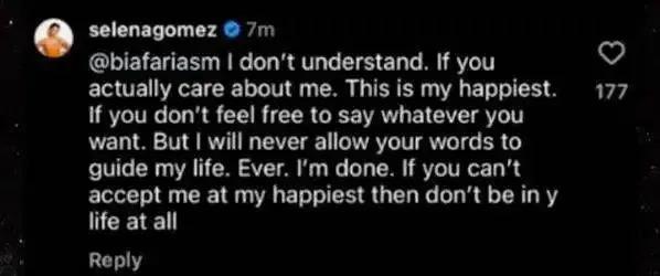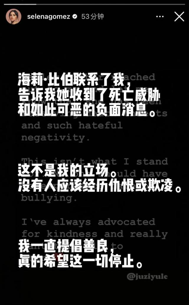 赛琳娜也是去年发布的 ins story,呼吁网民停止对海莉的网络暴力。