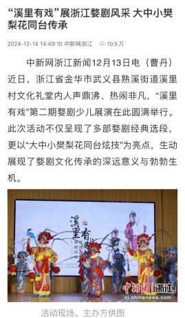 十二月十四日,中新网客户端报道了“溪里有戏”展浙江婺剧风采 大、中、小樊梨花同场传承,关注武义“溪里有戏”第二期婺剧儿童演出。本次活动不仅呈现了婺剧的多部经典选段,还以“大、中、小樊梨花同场炫耀技巧”为亮点,生动展现了婺剧文化传承的深远意义和活力。