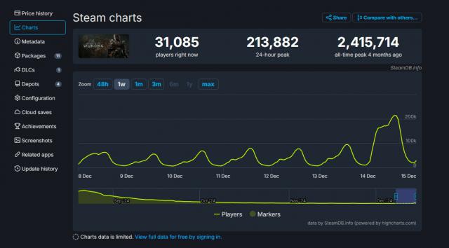另外,《黑神话:悟空》还在 2024 年 TGA 获得“最佳动作游戏”和“玩家之音奖”两项荣誉。这款游戏受到更新和获奖的多重影响。 Steam 平台活跃度大幅回升,24 与此同时,在线玩家的峰值达到 21.3 万人,重返 20 万量级。而且在此之前,《黑神话:悟空》在过去一周的同时,在线峰值仅保持在线。 8 万人上下,从未突破 10 万。