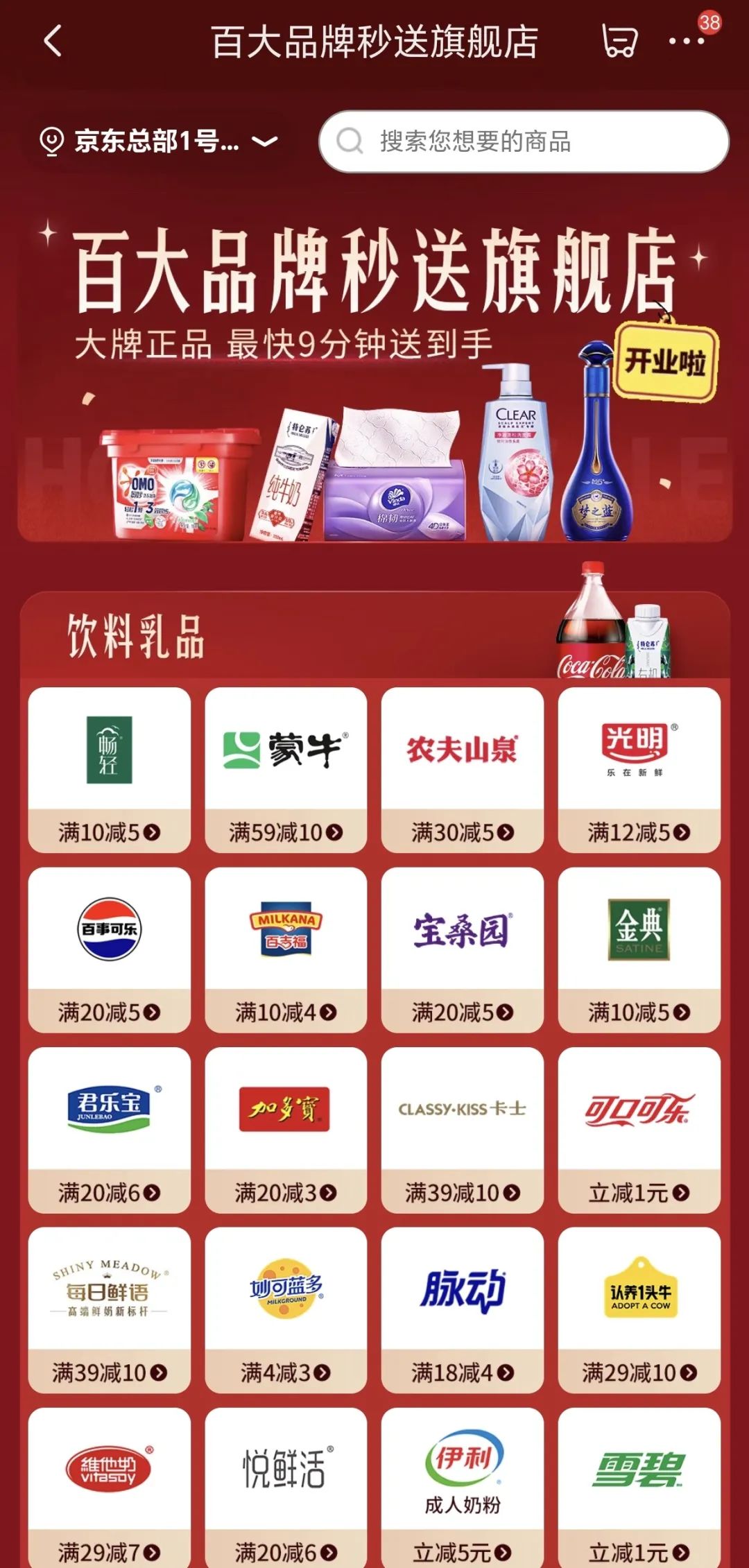 11月中下旬,JD.COM上线品牌秒送旗舰店,包括饮料乳制品、零食快餐、饮料、烹饪调味品、个人美容护理、日用品等10个品类,涵盖蒙牛、奥利奥、乌苏、金龙鱼、冷酸灵等100多个品牌。现在进入品牌秒送官旗页面,页面设置「首页」、「商品秒送」和「会员」三个分页。