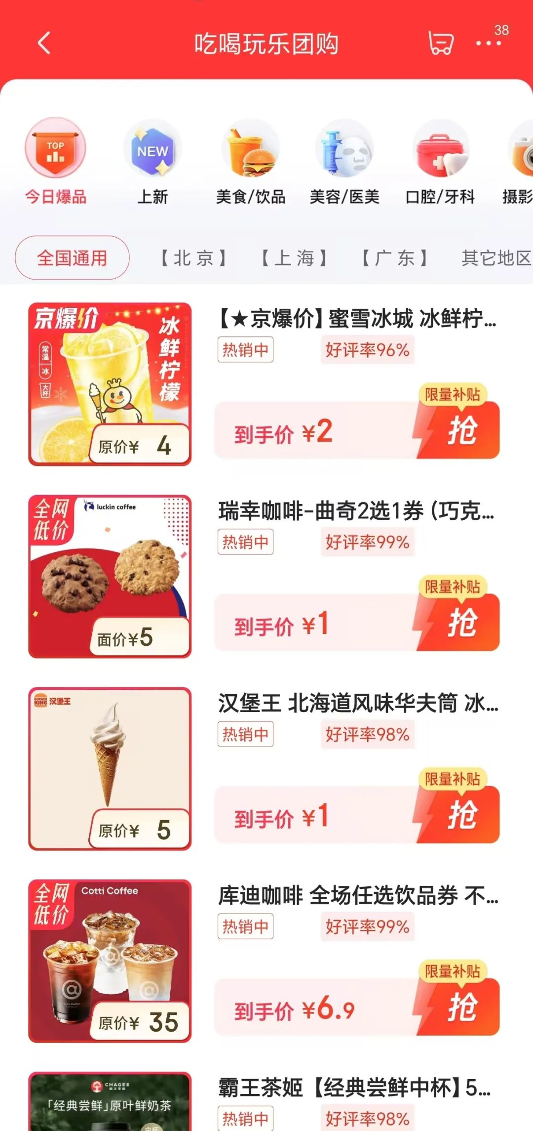 目前,美食饮料团购主要开放北京、上海和广东。对于美食饮料的团购,JD.COM仍然使用低价引流的常见思路。据JD.COM介绍,「JD.COM的餐饮团购又好又便宜。」、「超值团购,随心所欲囤积」。我们可以看到,有1元的汉堡王华夫筒,2元的蜜雪冰城,1元的永和王磨豆浆。以及刚才提到的2元团购补贴。