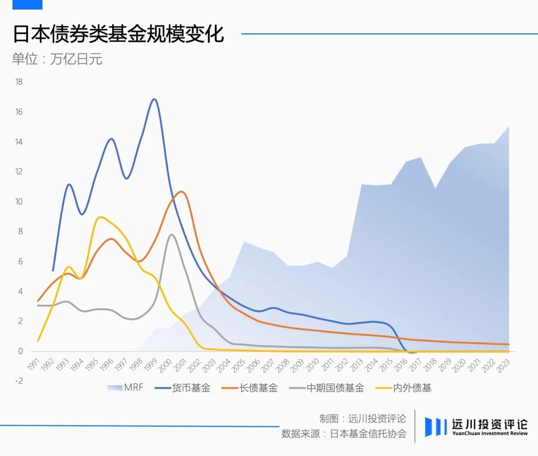 而且债券基金经理感叹职业道路越走越窄。看到日本这块别山之石,总是在讲恐怖故事:2023年长期债务基金规模为0.49万亿日元,仅为2001年巅峰时期的4.7%,日本货基、中期国债、内外债基已归零。