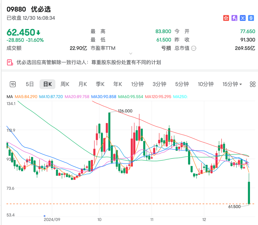 优必选暴跌31.6%,报62.45港元,成交额达22.9亿港元。此前,公司主席兼首席执行官周剑与多名股东停止了一致行动协议,多方投票权降至30%以下,不再是控股股东。市场预测部分股东可能会减持套现,周剑承诺未来一年不会减持其持有的h股。