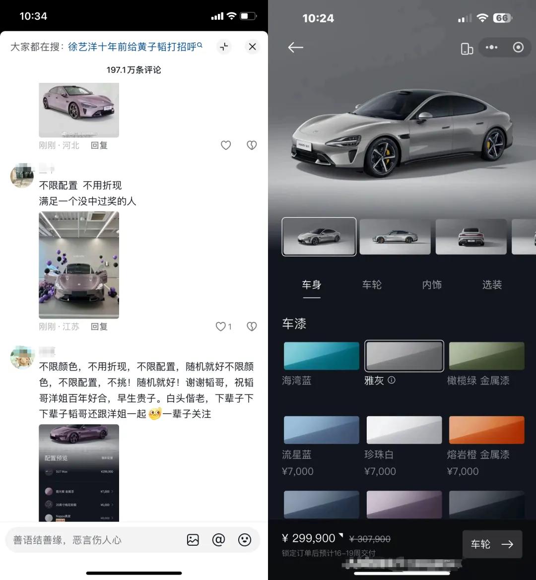 小米SU7的首发时间是去年12月。即使今年3月28日上市,也已经过去了半年。结果,黄子韬直播间的评论区不仅热度延迟,还被玩成了“大型车展现场”。