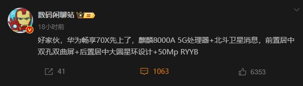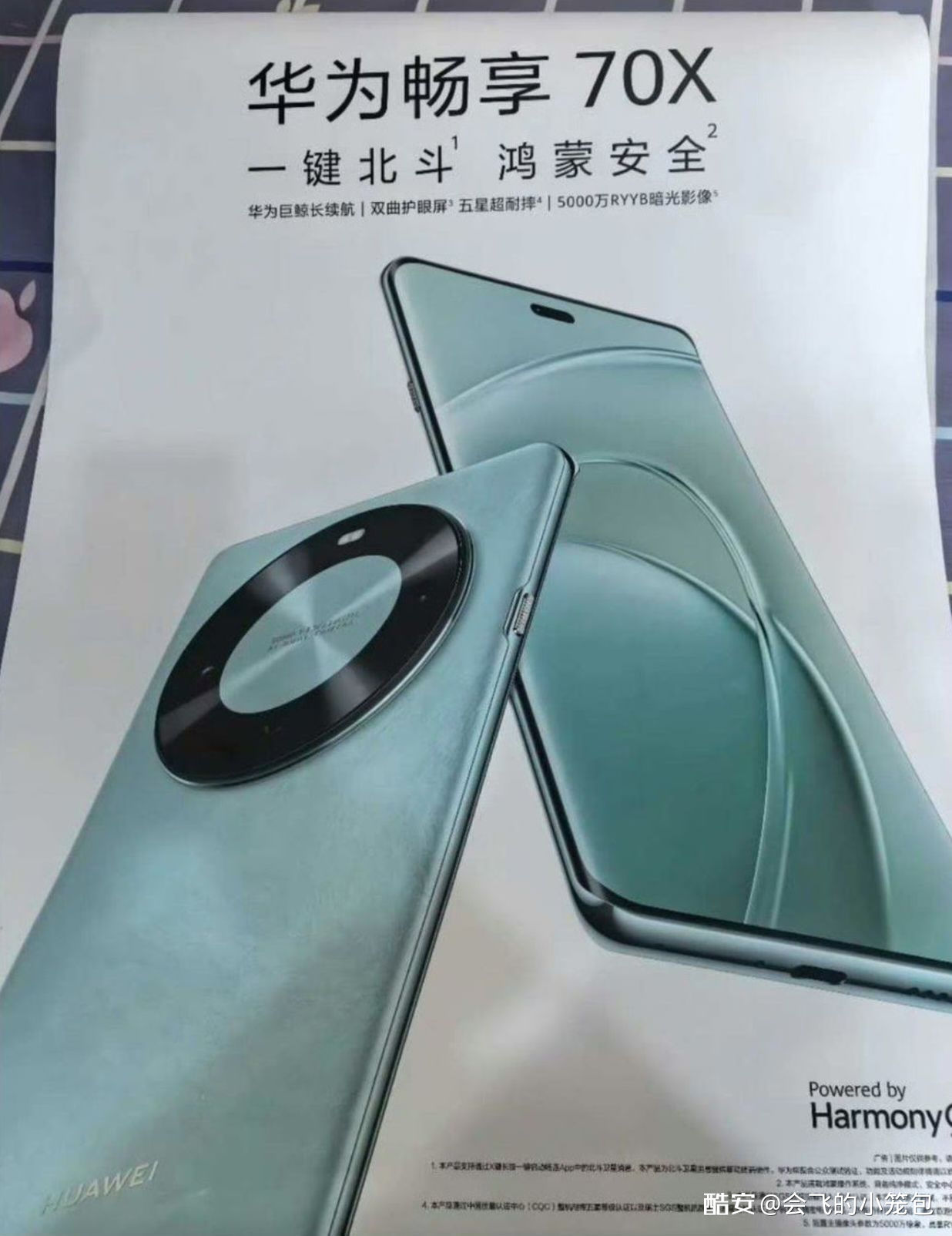 据微博数码博主@数码聊天站消息,华为即将推出享受70X新手机。,该机配备了全新的麒麟5GCpu,支持北斗卫星消息,配备50MP。 RYYB主摄,预计华为商城和线下门店将于明年1月初直接上架。