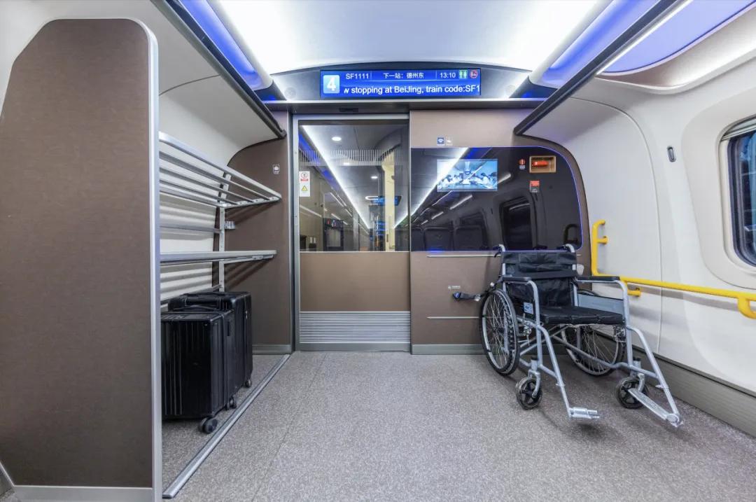 除了座位,新高铁的其他细节也有所加强——比如更高端、更干净的卫生间;比如车站显示,从一万年不变的LED滚动字幕变成了带地图的图片显示;比如轮椅或者自行车可以放在行李间扩大。