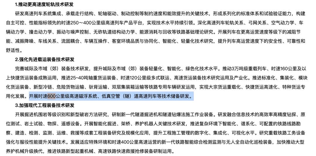事实上,看完《十四五》铁路科技创新规划,你会发现一个“可怕”的事实——时速400公里的高铁其实算不了什么,中国铁路的规划比这个要野得多——在“重点工程”部分,明确提出“开发时速600公里的高速磁浮系统、低真空管道(隧道)轨道列车等技术实力。”