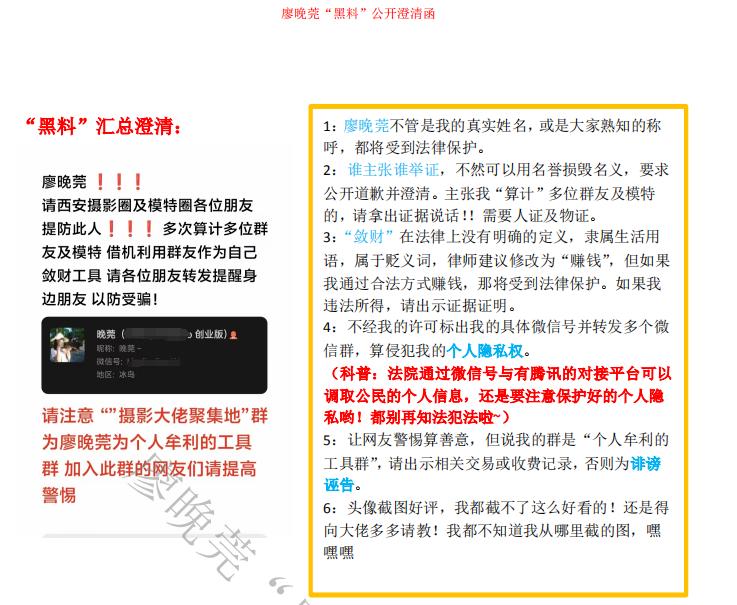 随后,关于廖小姐的“黑料”不断蔓延到西安各大拍摄群聊,最终引发网络灾难,只能诉诸法律。