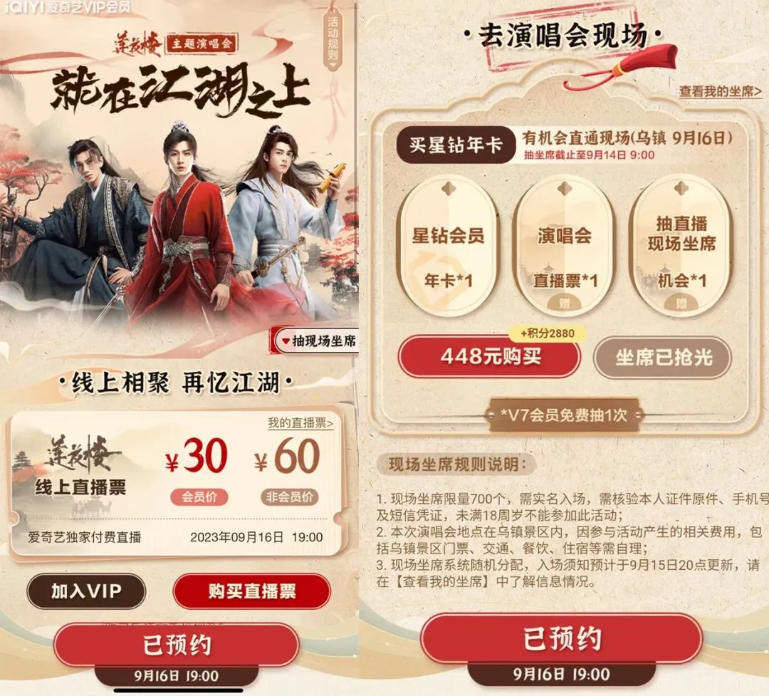 2023年,由成毅、曾舜曦、肖顺尧等演员主演的《莲花楼》大受欢迎,主题演唱会接踵而至,线上直播和线下表演“同时进行”。爱奇艺线上直播定价:会员30元,非会员60元,“堪比去电影院看电影”。线下观看门槛更高——只有购买488元的星钻VIP年卡,才有资格提取现场座位。