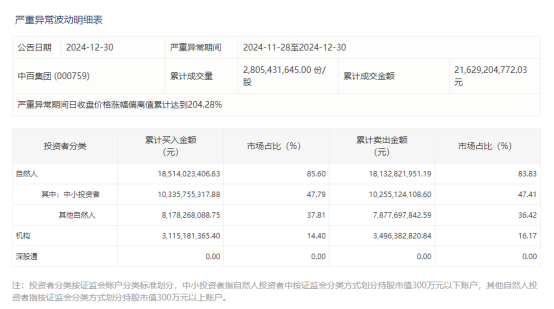 十二月三十日,据深交所介绍,中百集团11月28日至12月30日累计上涨204.87%,股价出现严重异常波动,其中自然人购买185.14亿元,占85.60%。;其中,中小投资者累计购买103.36亿元,占47.79%。该机构投资者累计购买31.15亿元,占14.4%。