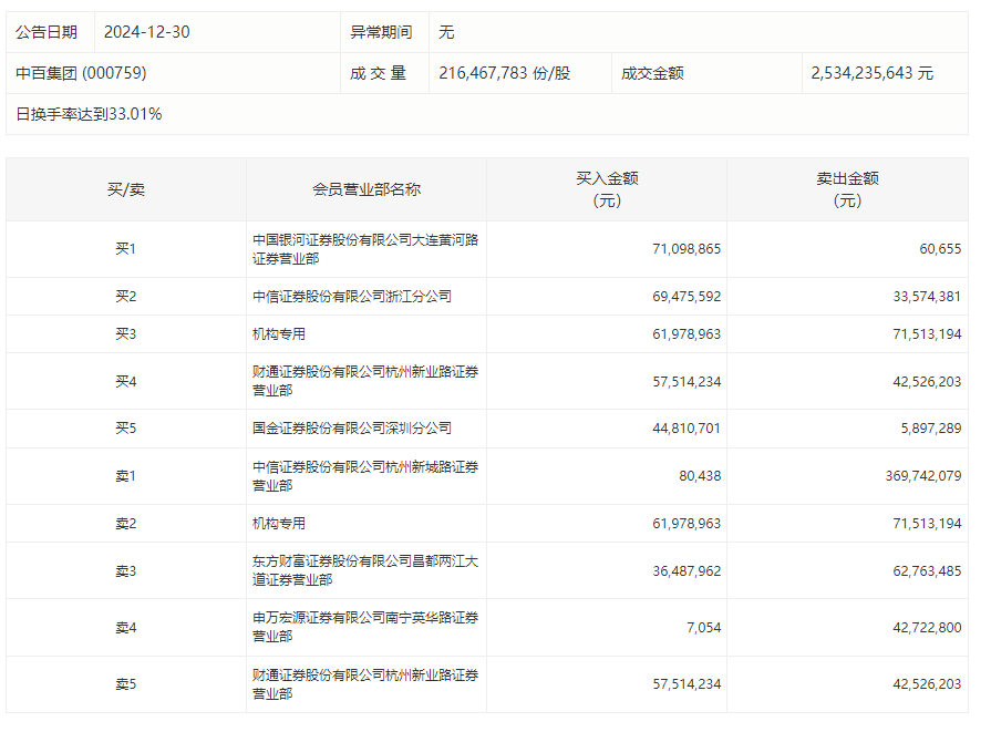 12 月 30 当天,中百集团股价再次上涨,全天换手率33.01%,成交额25.34亿元。根据龙虎榜的数据,该机构净销售额为953.42万元,营业部总销售额为2.78亿元。
