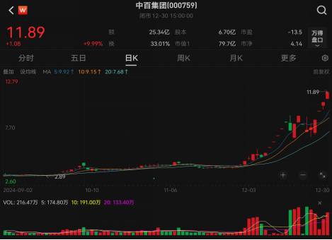 长期来看,根据深交所披露,11月28日至12月30日期间,中百集团累计上涨近205%,在严重异常期间,自然人购买了185.14亿元,占85.60%。;其中,中小投资者累计购买103.36亿元,占47.79%。该机构投资者累计购买31.15亿元,占14.4%。