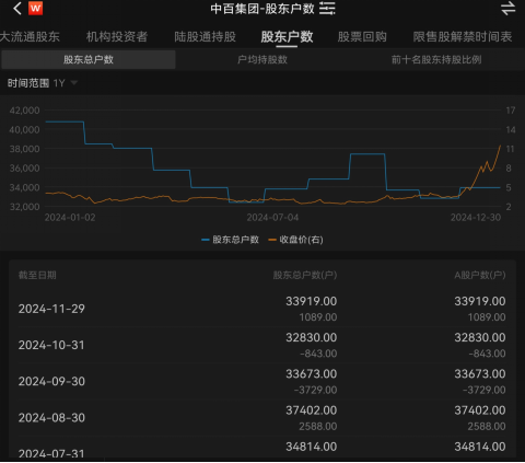 根据Wind数据,截至今年11月29日,中百集团已有33919户股东。