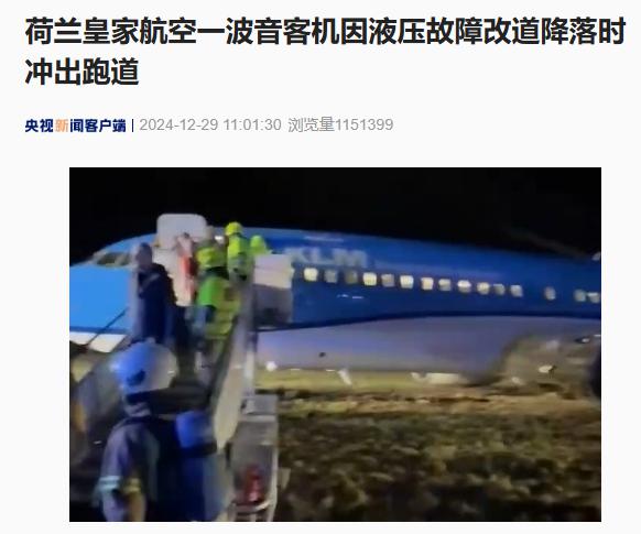 荷兰皇家航空的一波音频客机因液压故障而冲出跑道。
