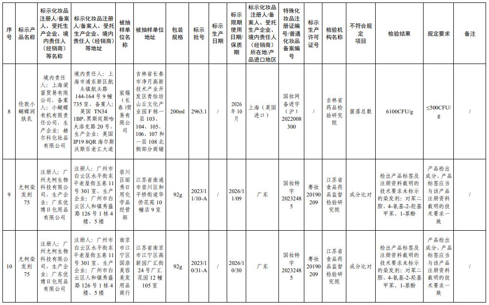 根据《化妆品监督管理条例》、《化妆品生产经营监督管理办法》和《化妆品抽样检验管理办法》,国家医药产品管理局要求天津市、上海市、江苏省、广东省医药产品管理局依法对不符合要求的化妆品涉及的注册人、备案人、委托生产企业立即采取风险控制措施,并对相关企业进行自查整改。