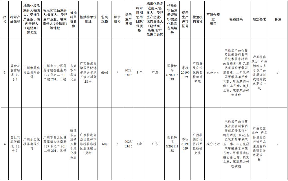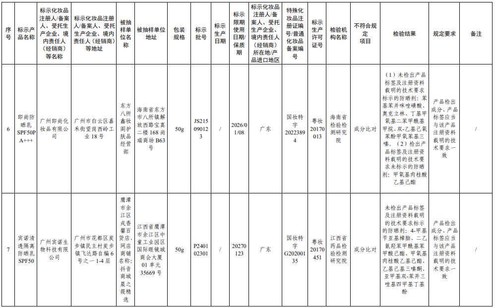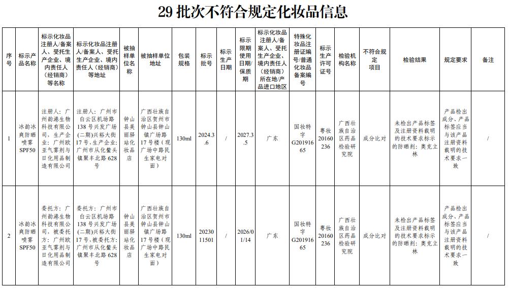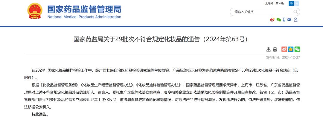 通知称,在2024年全国化妆品抽样检验工作中,经广西壮族自治区药品检验研究院等单位检验,商品标签名称为“冰韵酷防晒喷雾SPF50”等29批化妆品,不符合要求。