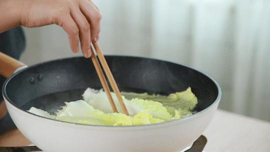 将水放入娃娃菜中焯水 3 分钟烫熟,