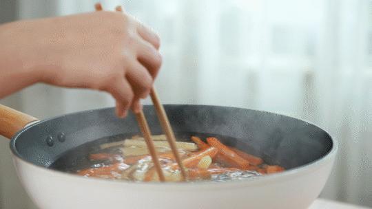 然后将土豆条、胡萝卜条焯水 5-7 分钟烫熟,