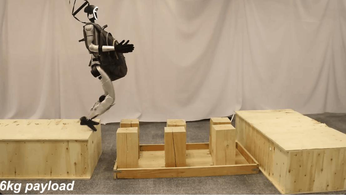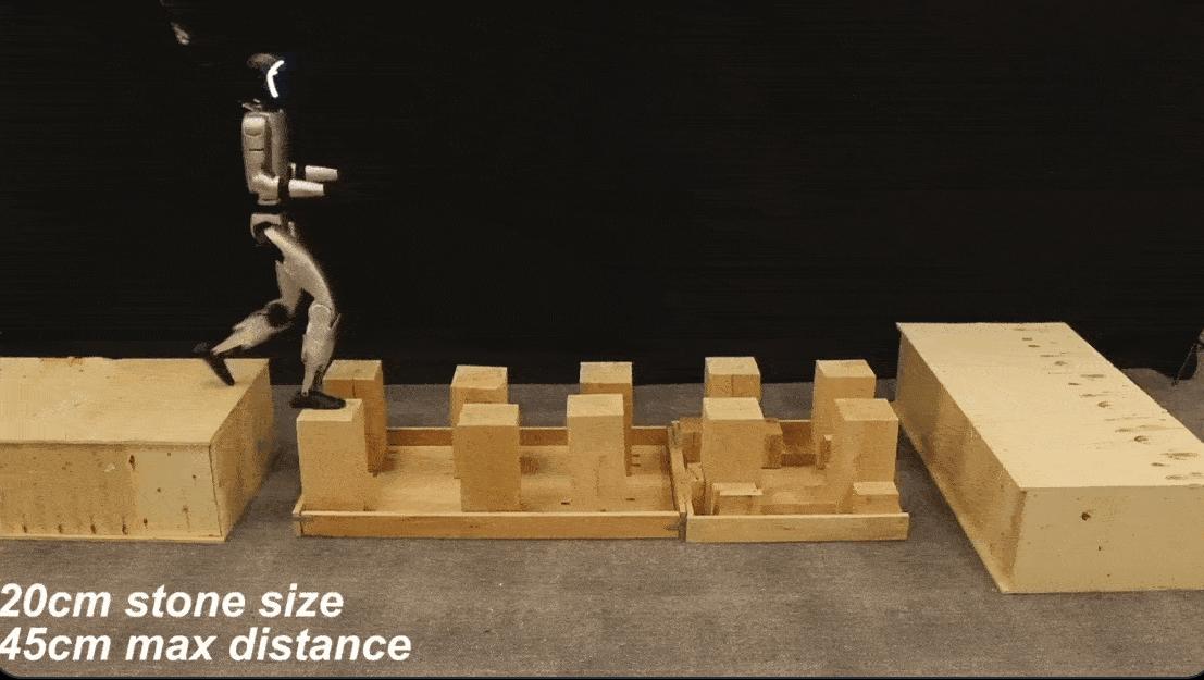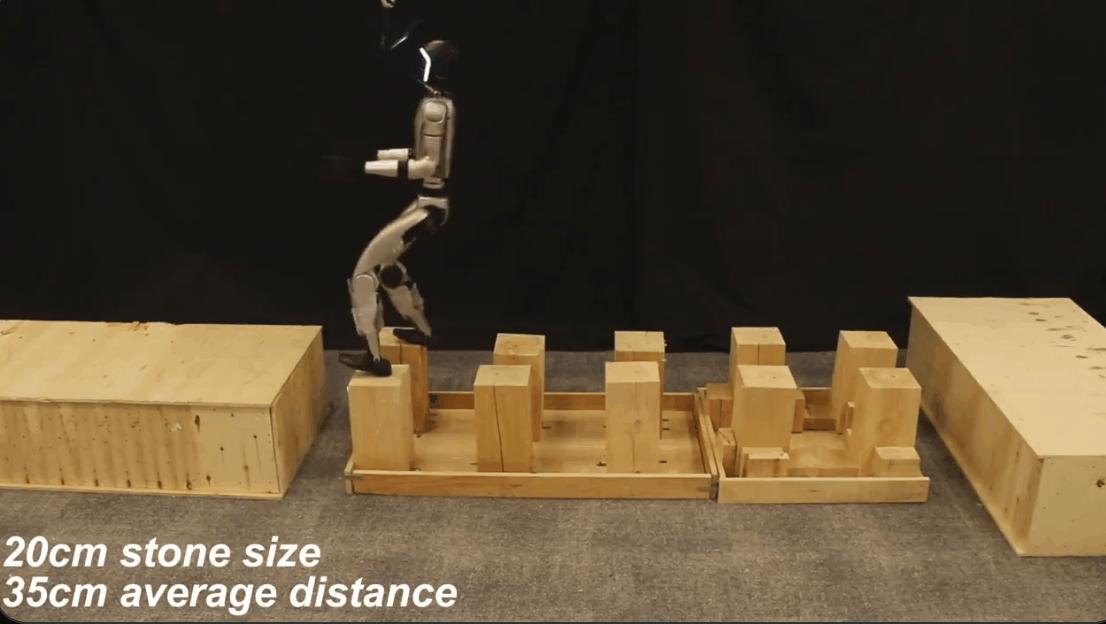 在演示中,G1可以像梅花桩一样稳定地穿越许多面积约20厘米宽、间隔不同的踏脚石。甚至,它也可以后退穿越踏脚石。