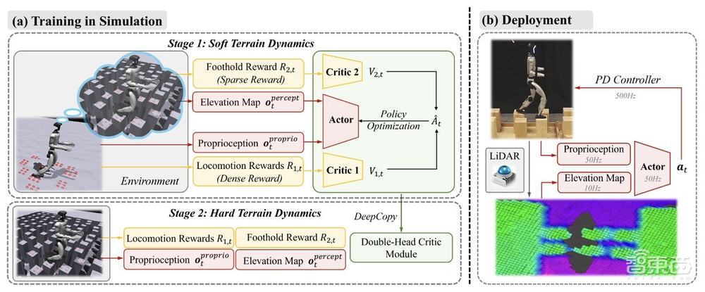 - 制定了强化两个阶段的学习训练策略,使机器人学习更加高效。让机器人在第一阶段平地练习,通过输入地形参数,让算法在安全环境中预先学习;第二阶段切换到在实际任务地形中优化战略。